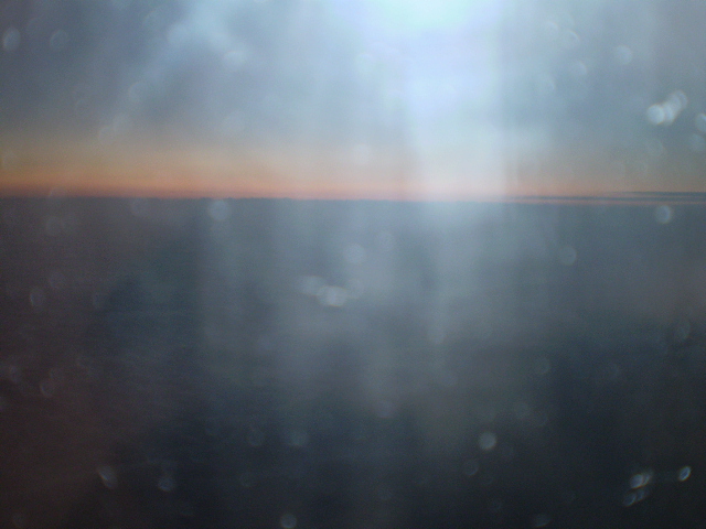 羽田空港を飛立ち、水平飛行に移った頃、雲海に沈む茜色の夕日が見えました。