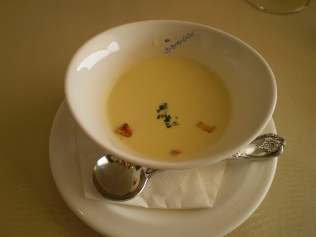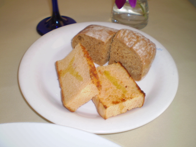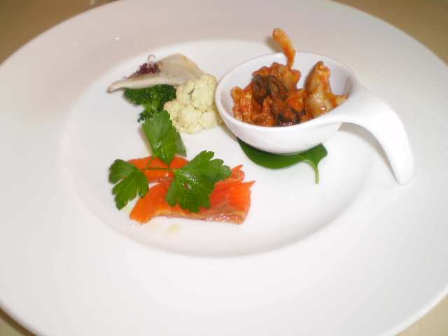 前菜はつぶ貝と烏賊のソテーに自家製スモークサーモン