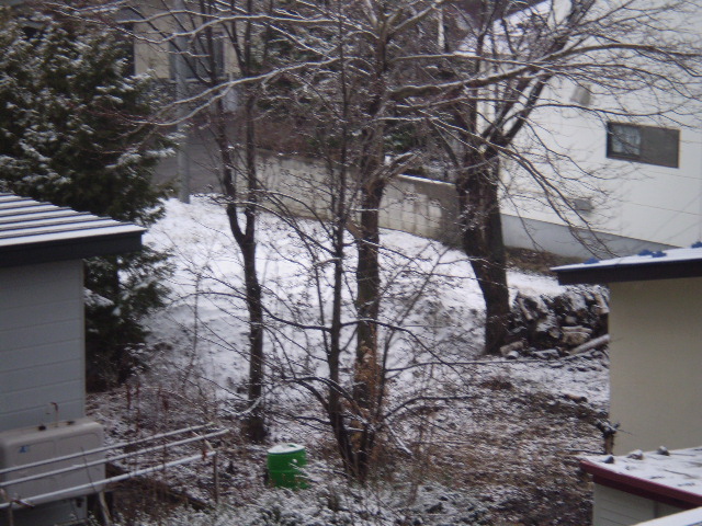 昨夜の雨が雪に変わり、薄っすら雪景色に